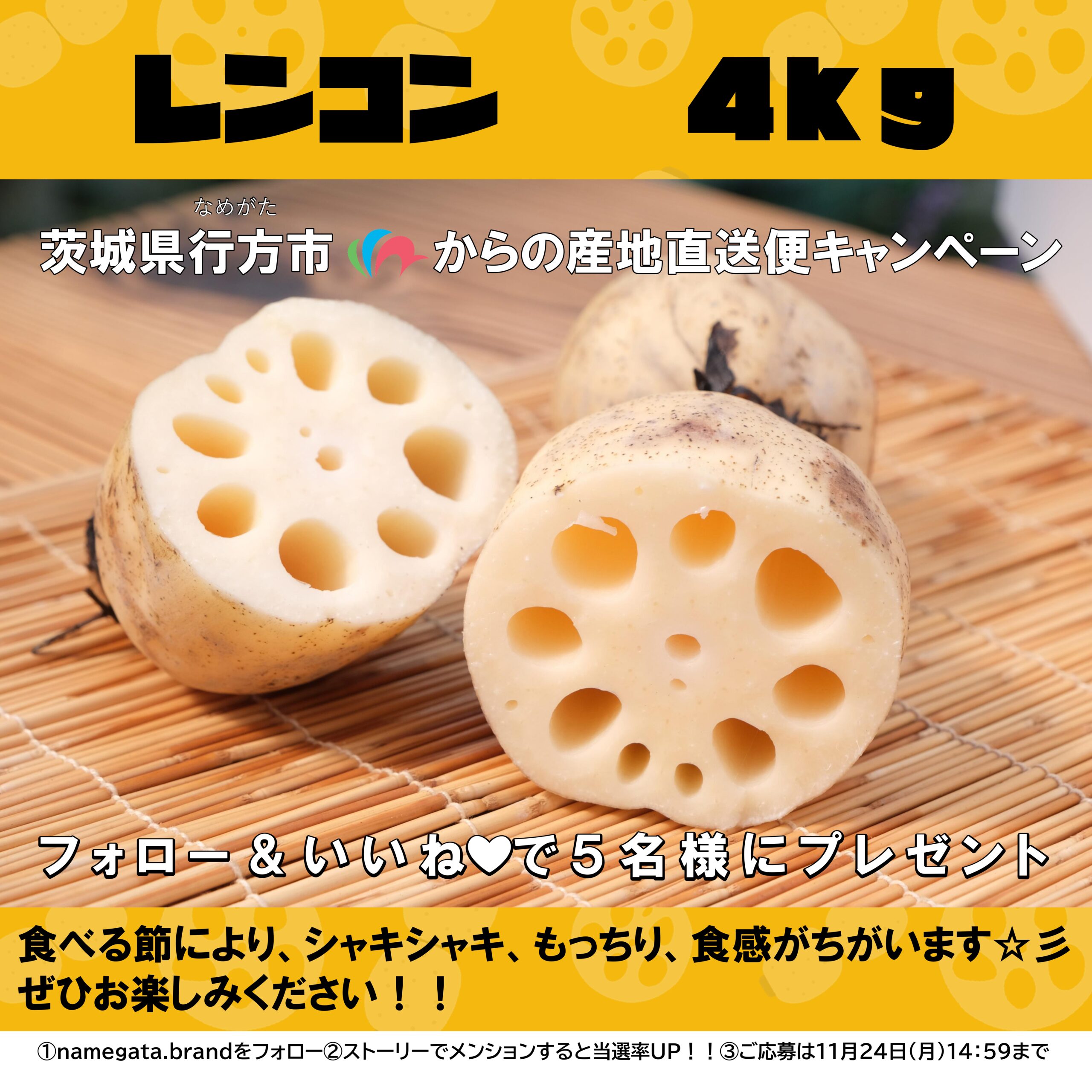 なめがたブランド戦略会議のInstagramアカウント(@namegata.brand)をフォロー&キャンペーン投稿をいいねいただいた方の中から、抽選で5名様へ『レンコン 4kg』をプレゼントします